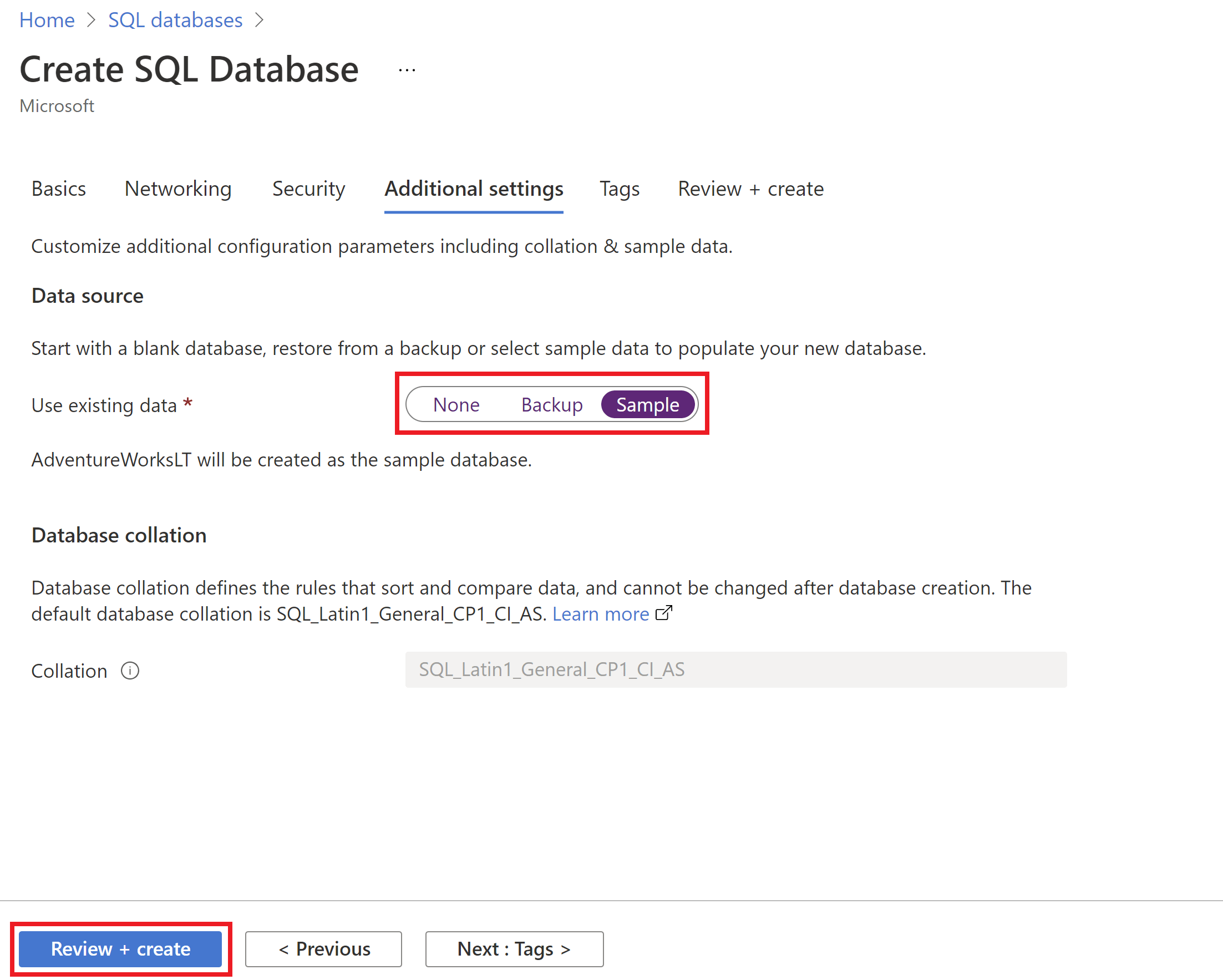 AdventureWorksLTbazy danych, więc istnieje kilka tabel i danych do wykonywania zapytań i eksperymentowania, w przeciwieństwie do pustej pustej bazy danych. Można również skonfigurować sortowanie bazy danych i okno obsługi.Wybierz opcję Recenzja i utwórz.