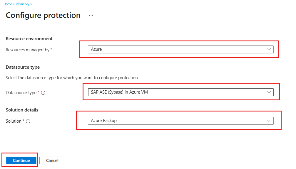 W okienku Konfigurowanie ochrony wybierz pozycję Zasób zarządzany przez platformę Azure, Typ źródła danych jako SAP ASE (Sybase) na maszynie wirtualnej platformy Azure i Rozwiązanie jako usługa Azure Backup.