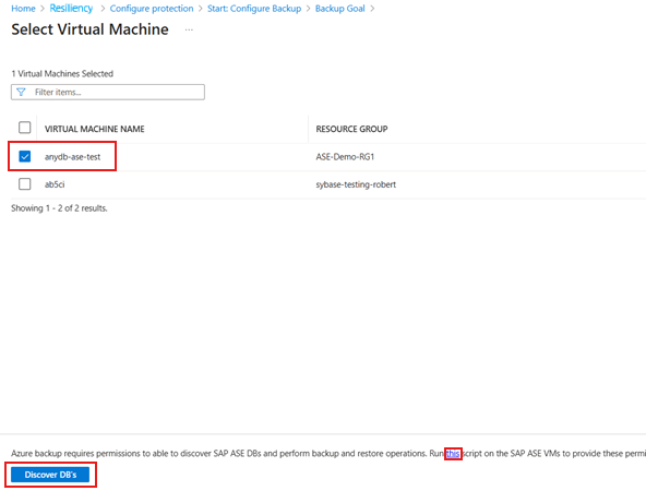 Usługa Azure Backup odnajduje wszystkie bazy danych SAP ASE na maszynie wirtualnej. Podczas odnajdywania usługa Azure Backup rejestruje maszynę wirtualną w skarbcu i instaluje rozszerzenie na maszynie wirtualnej. W bazie danych nie zainstalowano żadnego agenta.