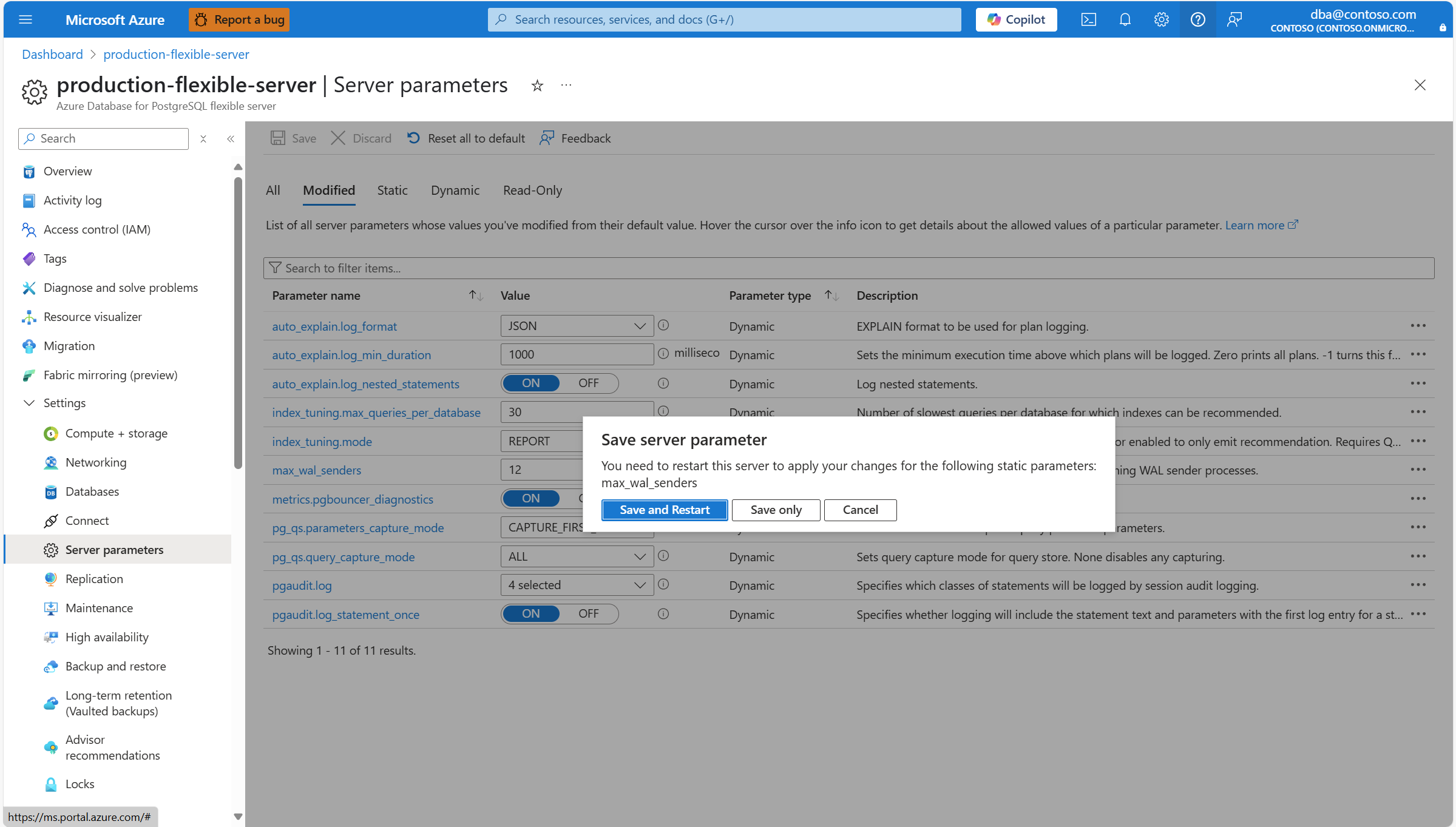 Jeśli w przypadku któregokolwiek z parametrów, których bieżąca wartość nie jest zgodna z ich wartością domyślną, typ parametru jest równy Statyczny, serwer wymaga ponownego uruchomienia zmiany, aby zmiany zaczęły obowiązywać. W takim przypadku zostanie wyświetlone okno dialogowe, aby wybrać, czy chcesz:
