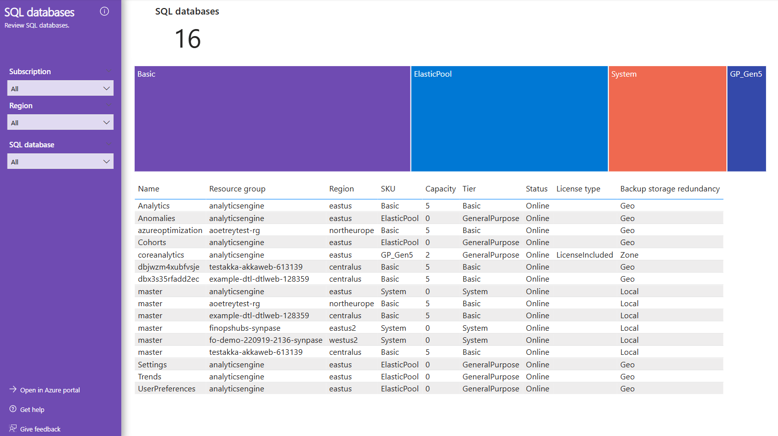 Strona Bazy danych SQL zawiera listę baz danych SQL.