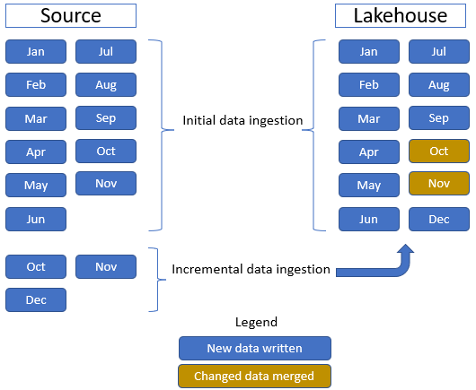 W tym samouczku używamy tabeli faktów Sprzedaż , która zawiera jeden folder nadrzędny z danymi historycznymi przez 11 miesięcy (z jednym podfolderem dla każdego miesiąca) i innym folderem zawierającym dane przyrostowe przez trzy miesiące (jeden podfolder dla każdego miesiąca). Podczas początkowego pozyskiwania danych dane są pozyskiwane do tabeli lakehouse przez 11 miesięcy. Jednak po nadejściu danych przyrostowych zawiera zaktualizowane dane dla października i listopada, a nowe dane z grudnia i listopada są scalane z istniejącymi danymi, a nowe dane z grudnia są zapisywane w tabeli lakehouse, jak pokazano na poniższej ilustracji: