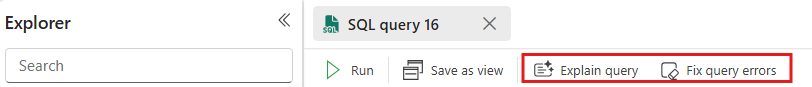 Istnieją dwie szybkie akcje oparte na sztucznej inteligencji, które są obecnie obsługiwane przez Copilot w Fabric w obciążeniu bazy danych SQL: Wyjaśnij i Napraw.