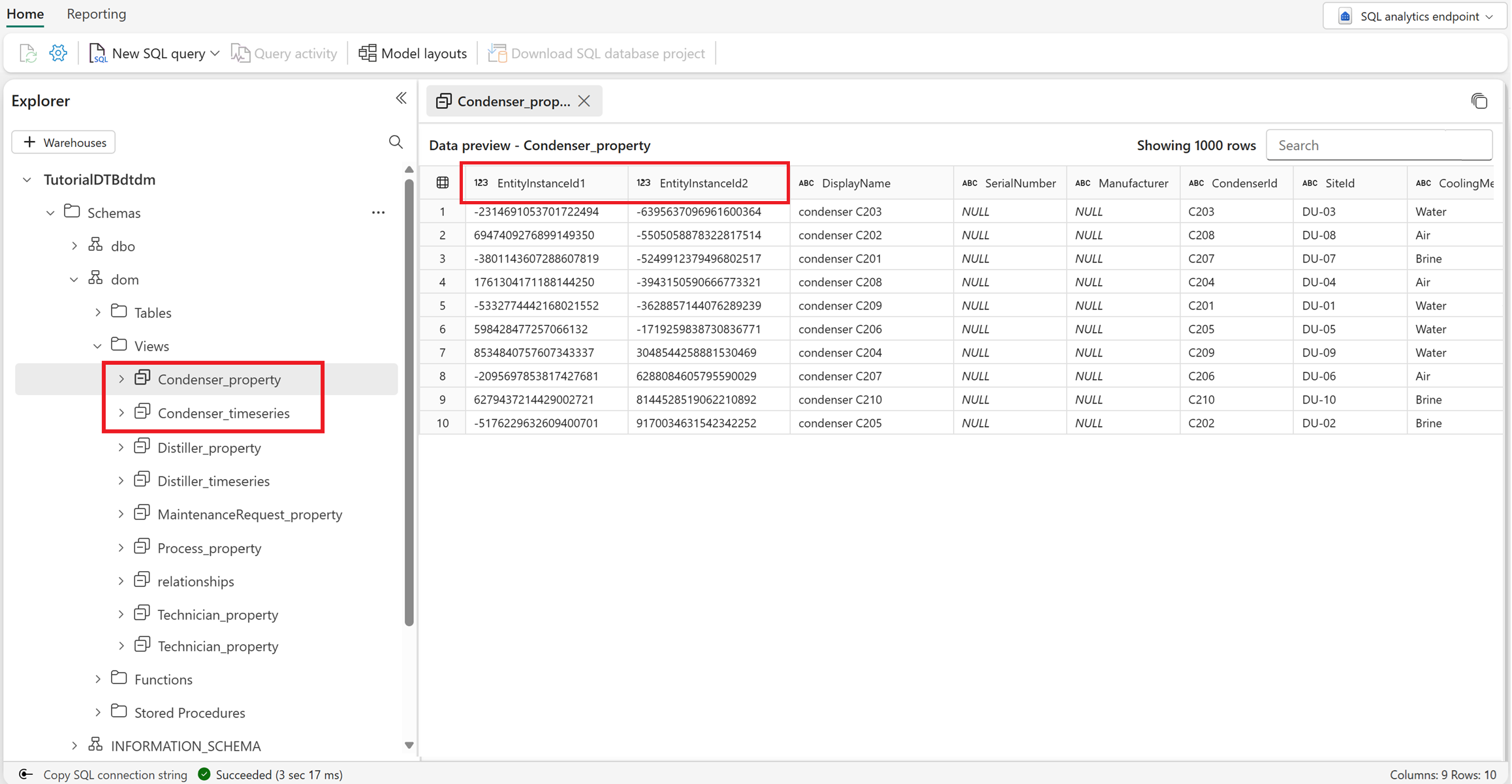 Przejdź do obszaru roboczego Fabric i zidentyfikuj punkt końcowy SQL lakehouse skojarzony z elementem budowniczego cyfrowych bliźniaków. Punkt końcowy SQL ma taką samą nazwę jak element konstruktora cyfrowej reprezentacji bliźniaczej z rozszerzeniem dtdm , więc w tym przypadku nosi nazwę TutorialDTBdtdm.