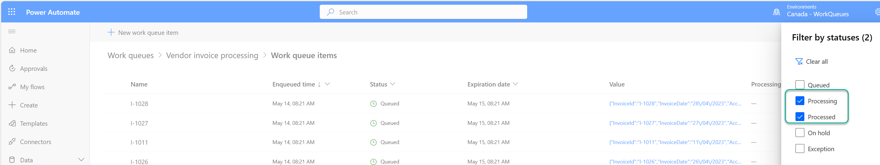 Aby potwierdzić, że element kolejki pracy został przetworzone, można przejść do strony szczegółów kolejki pracy, wybrać opcję Wyświetl wszystkie w sekcji elementów kolejki pracy i filtrować elementy według stanu Przetworzone.