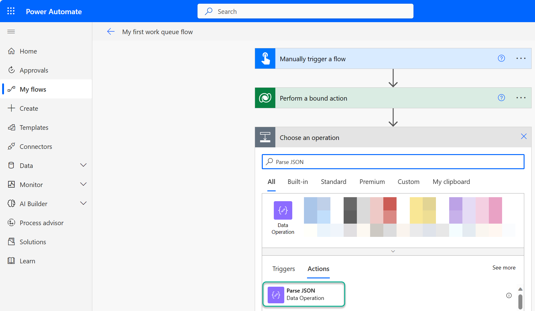 - Dodaj nowy krok, wybierając + Nowy krok i wyszukaj akcję o nazwie Analizuj JSON i zaznacz ją.