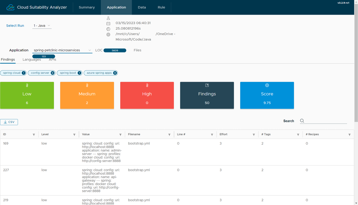Analizator przydatności chmury można pobrać do środowiska deweloperskiego, a następnie przeskanować kod źródłowy do oceny. Wszystkie wyniki są przechowywane w środowisku lokalnym. Raport oceny zawiera oszacowanie, ile wysiłku jest wymagane do przeprowadzenia migracji aplikacji Spring do chmury. Raport zawiera również listę problemów na poziomie wiersza kodu ocenianych według ważności.