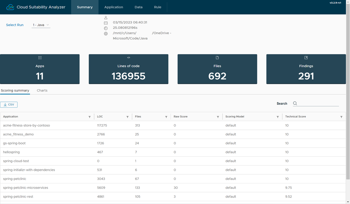 Cloud Suitability Analyzer szacuje gotowość aplikacji Spring na platformach w chmurze, pasując do wzorców względem kodu źródłowego. Narzędzie przypisuje każdemu problemowi nieprzetworzony wynik na podstawie zestawu wstępnie zdefiniowanych lub dostosowanych reguł. Następnie narzędzie oblicza wynik techniczny z zakresu od 0 do 10 dla każdej aplikacji na podstawie sumy nieprzetworzonych wyników. Im więcej aplikacji jest gotowych do chmury, tym wyższa jest jego ocena techniczna.