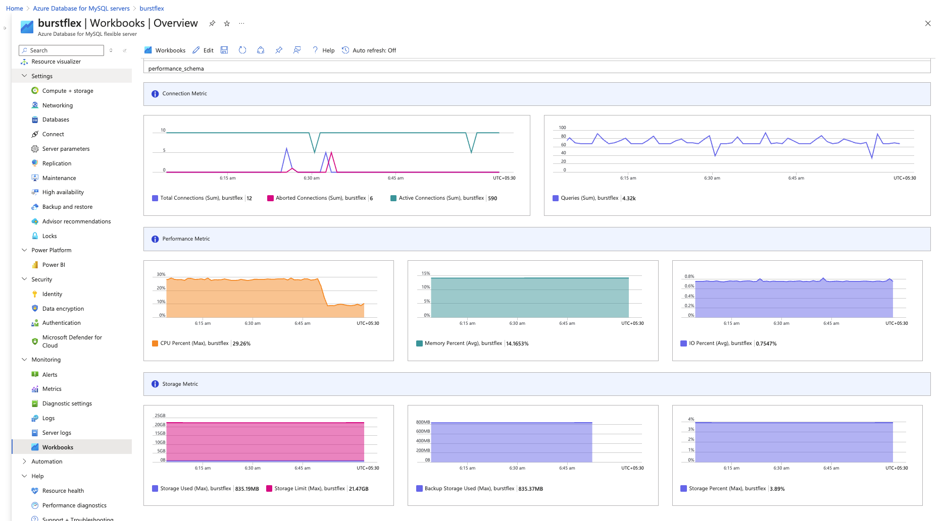 W portalu Azure, po lewej stronie, w sekcji Monitorowanie dla elastycznego serwera bazy danych MySQL na platformie Azure, wybierz pozycję Skoroszyty.