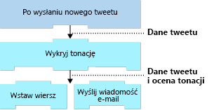 Wyzwalacze i akcje są zasadniczo wywołaniami podstawowej operacji interfejsu API. Każda operacja ma dane wejściowe i wyjściowe. Na przykład wyzwalacz wyszukiwania Bing o nazwie W nowym artykule z wiadomościami przyjmuje ciąg wyszukiwania i zwraca artykuł zawierający ten ciąg. Akcja usług Cognitive Services o nazwie Sentyment przyjmuje ciąg znaków jako dane wejściowe i zwraca wynik sentymentu jako liczbę zmiennoprzecinkową. Na poniższym diagramie przedstawiono te dwie operacje: