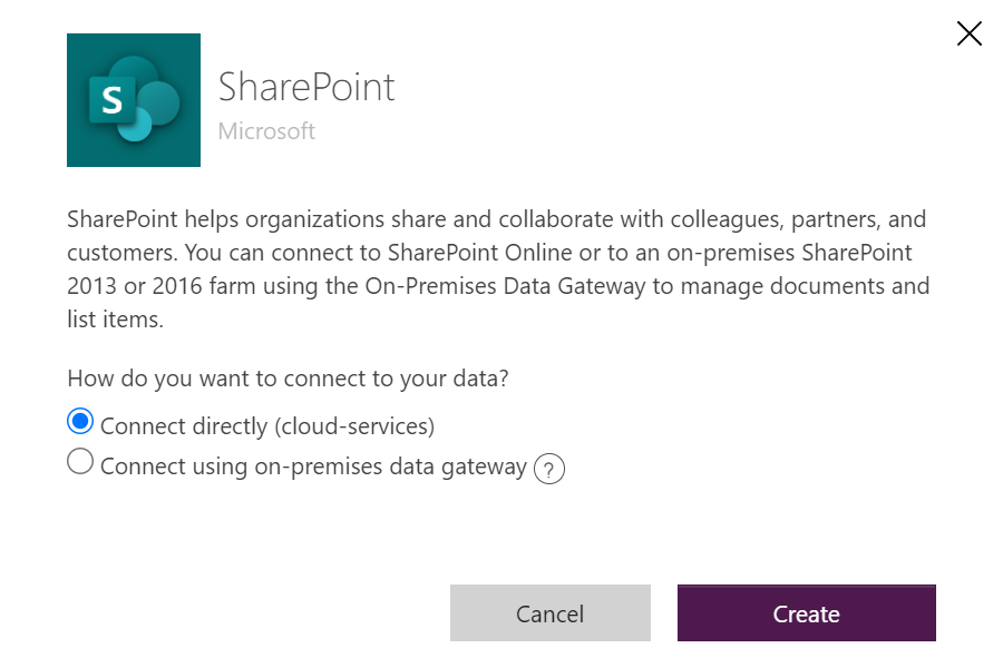 Aby nawiązać połączenie z usługą SharePoint Online, wybierz pozycję Połącz bezpośrednio (usługi w chmurze), a następnie wybierz pozycję Utwórz, a następnie, jeśli zostanie wyświetlony monit, podaj poświadczenia.