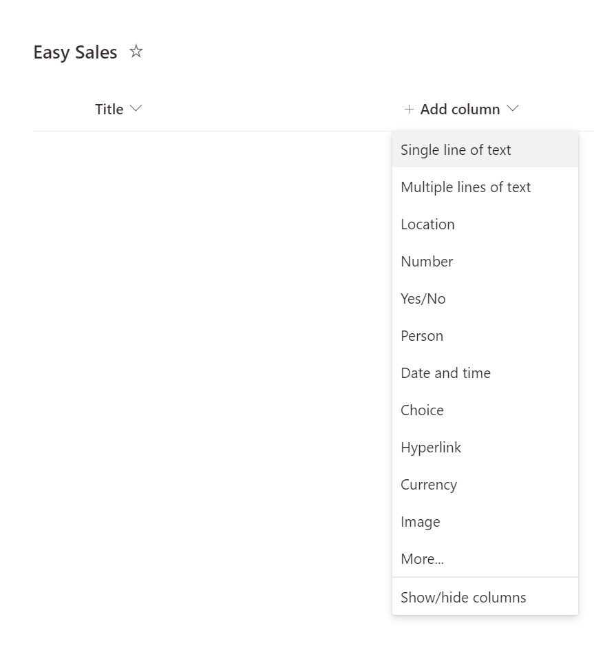 Na utworzonej liście Easy sales wybierz + Dodaj kolumnę, aby dodać kolumnę określonego typu. Poniższa lista zawiera kolumny, które należy utworzyć, z nazwami i typami w tym formacie: Nazwa kolumny — typ kolumny.