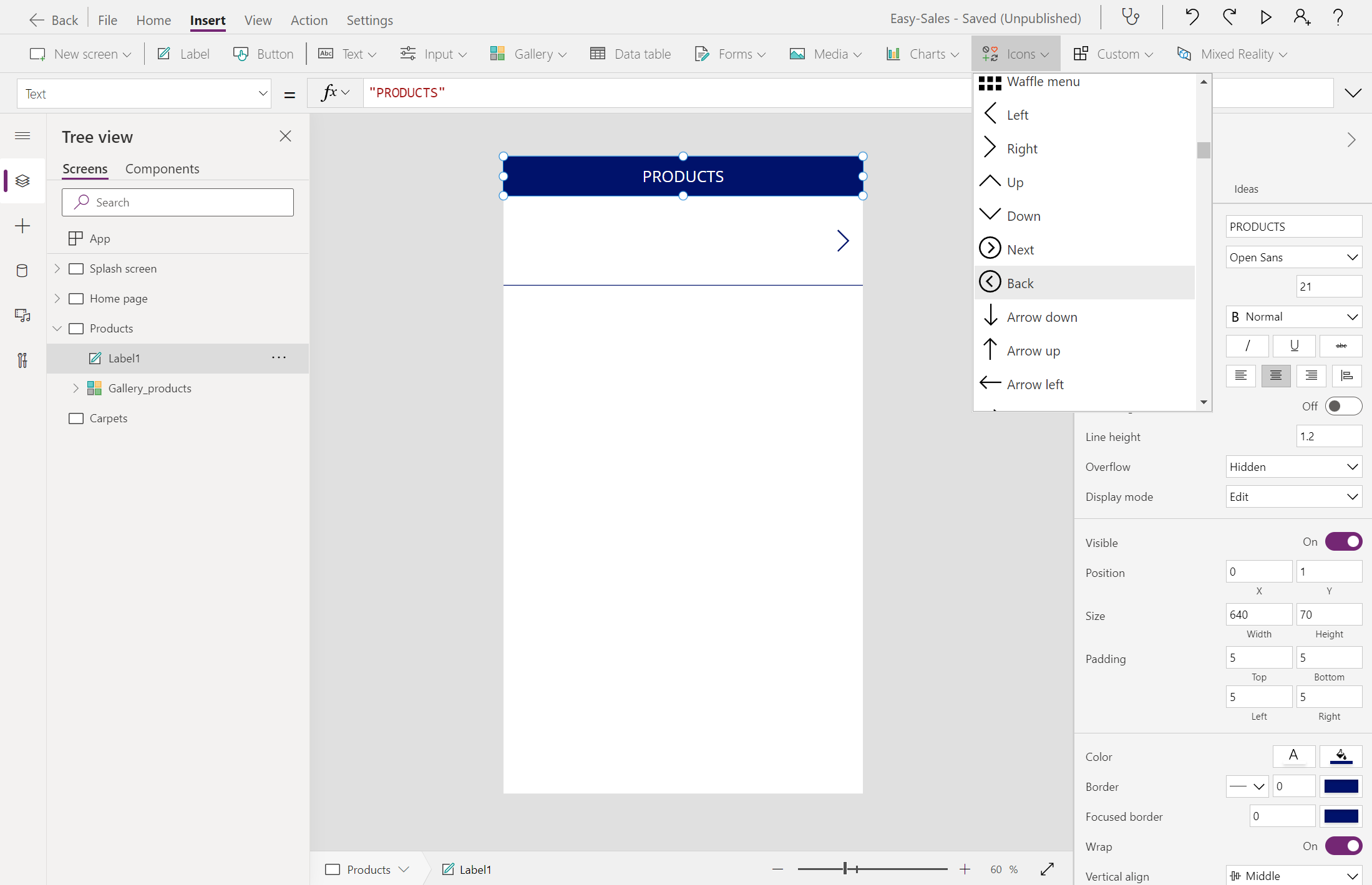 Dodaj ikonę Wstecz na wcześniej dodaną etykietę, aby pomóc użytkownikowi w nawigacji do strony głównej. Aby dodać ikonę Wstecz, rozwiń listę rozwijaną Ikony i wybierz ikonę Wstecz.