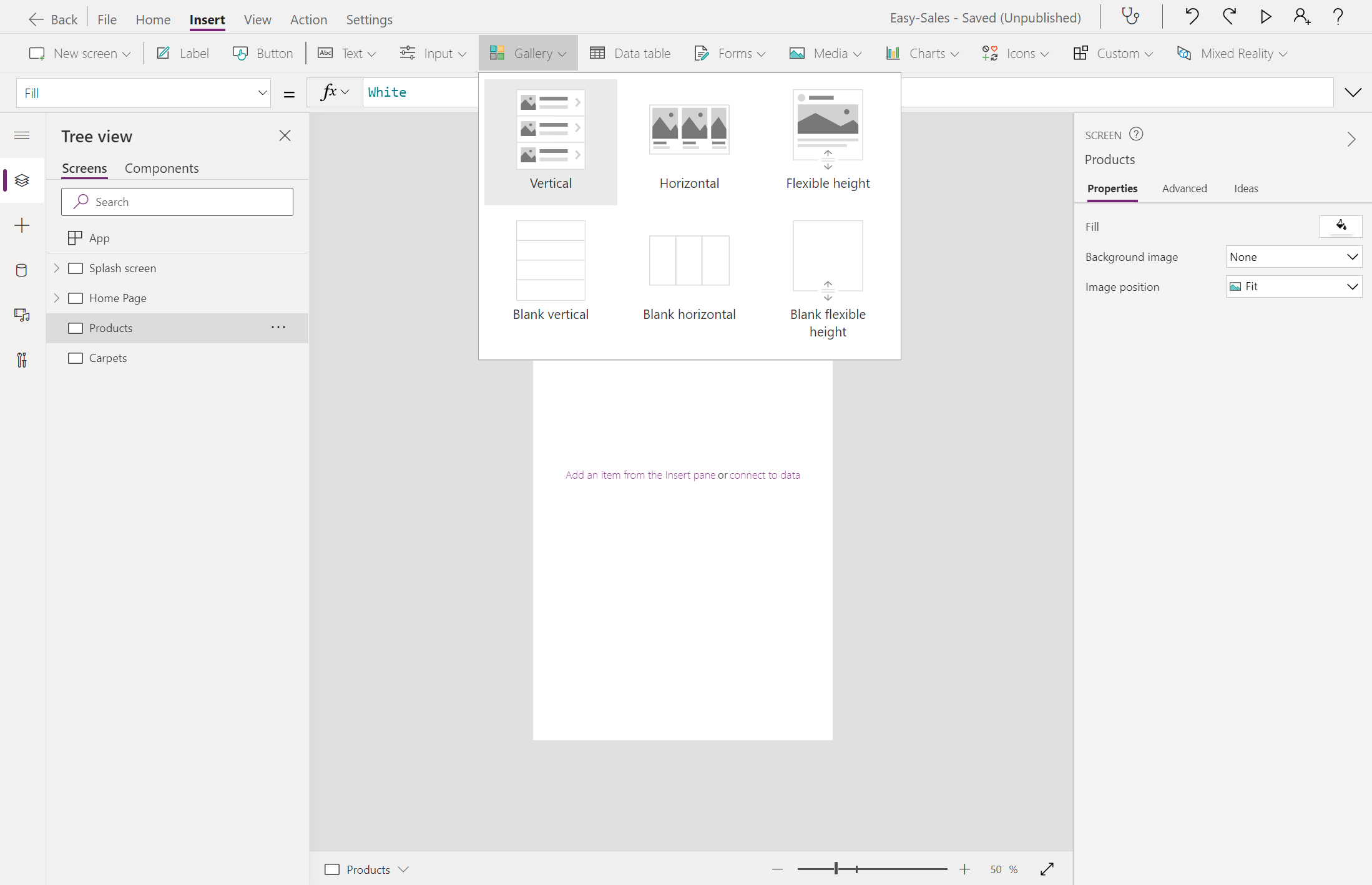 Na ekranie Products, na karcie Wstaw, wybierz pozycję Galeria>Pionowa, aby dodać kontrolkę galerii do ekranu.