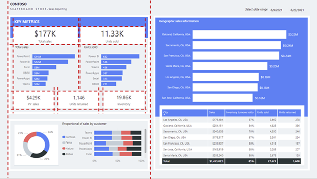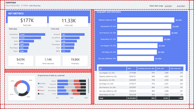 Zdefiniuj dorozumiane sekcje, wyrównając grupy wizualizacji w bliskiej odległości. W poniższym przykładzie pokazano, jak odstępy oddzielają wizualizacje. W tym przykładzie pokazano, jak dobrze zastosowane odstępy (wyróżnione liniami przerywanymi) mogą przekazywać skojarzenie i kierować uwagę konsumenta raportu, zapewniając równowagę i strukturę na stronie raportu.
