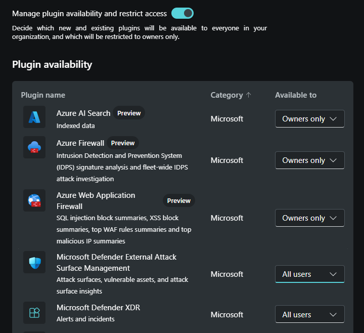 Wtyczki — copilot obecnie obsługuje wtyczki dla własnych produktów zabezpieczeń firmy Microsoft, produktów innych niż Microsoft, źródeł danych analizy typu open source, informacji branżowych z publicznej sieci Web i wtyczek niestandardowych.