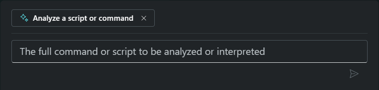 Wybranie możliwości systemu (sugestia monitu) zwykle wymaga większej ilości danych wejściowych, aby uzyskać przydatną odpowiedź, ale Copilot udostępnia te wskazówki. Na przykład poniższy obraz przedstawia informacje, które użytkownik musi uwzględnić w celu przeanalizowania skryptu lub polecenia.