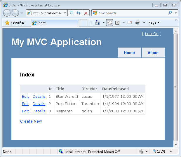 A exibição Índice que criamos na seção anterior inclui um link para criar novos registros de banco de dados. Vamos implementar a lógica e criar a exibição necessária para criar novos registros de banco de dados de filmes.