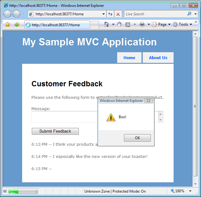 Observe que o valor de feedback.Message é codificado em HTML antes que o valor seja exibido com o seguinte código:
