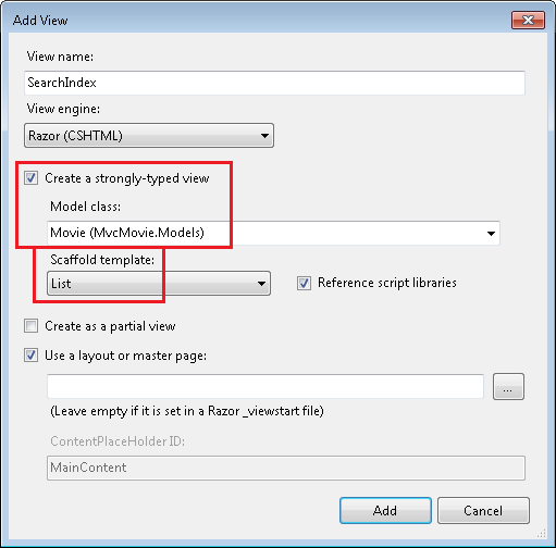 Agora você pode implementar a SearchIndex visualização que exibirá o formulário para o usuário. Clique com o botão direito do mouse dentro do SearchIndex método e clique em Adicionar Exibição. Na caixa de diálogo Adicionar Modo de Exibição , especifique que você passará um Movie objeto para o modelo de exibição como sua classe de modelo. Na lista Modelo de scaffold, escolha Lista e clique em Adicionar.
