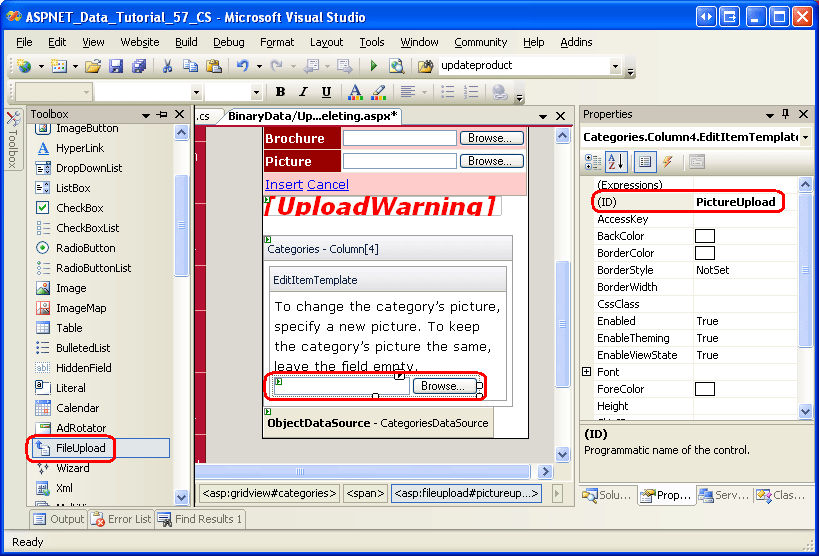 Figura 17: Adicionar um controle FileUpload à EditItemTemplate(Clique para exibir a imagem em tamanho real)