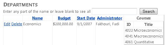 Clique em Editar em uma linha e altere o valor na coluna Orçamento . (Lembre-se de que você só pode editar registros criados para este tutorial, pois os registros de banco de dados existentes School contêm alguns dados inválidos. O registro para o departamento de Economia é seguro para experimentar.)