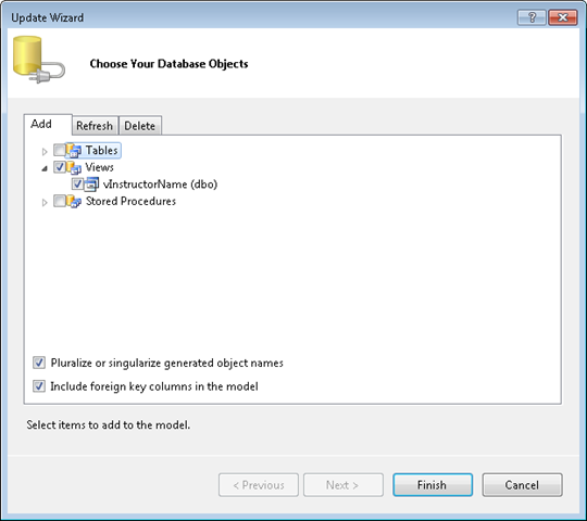 Quando você se refere à nova vInstructorName entidade no código, não deseja usar a convenção de banco de dados de prefixar um "v" de minúsculas nela. Portanto, você renomeará a entidade e a entidade definidas no modelo.