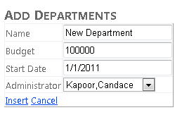 Essa marcação cria dois ObjectDataSource controles, um para inserir novas Department entidades e outro para recuperar nomes de instrutor para o DropDownList controle usado para selecionar administradores de departamento. A marcação cria um DetailsView controle para inserir novos departamentos e especifica um manipulador para o evento do ItemInserting controle para que você possa definir o valor da Administrator chave estrangeira. No final, há um ValidationSummary controle para exibir mensagens de erro.
