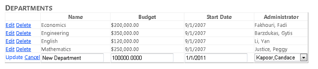 Use a página DepartmentsAdd.aspx para adicionar um novo departamento, execute a página Departments.aspx e clique em Editar na linha que você adicionou.