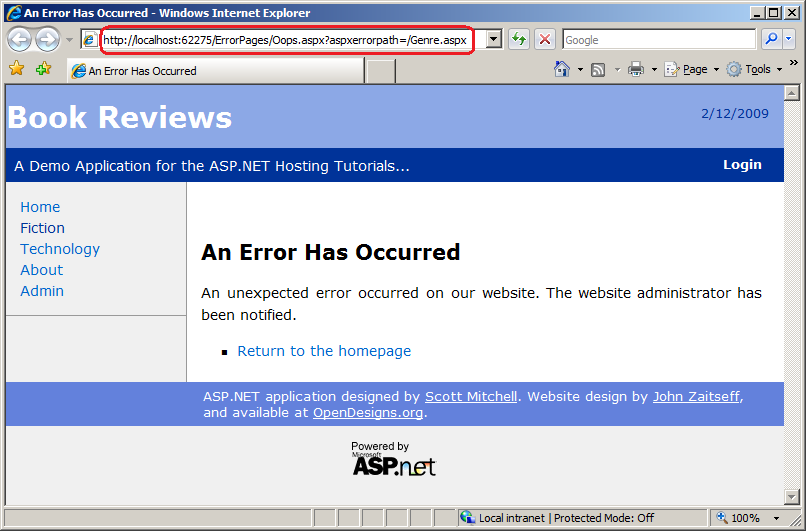 Para reproduzir esse erro no aplicativo Web de demonstração disponível para download, você pode visitar Genre.aspx?ID=foo diretamente ou clicar no link "Gerar um erro de runtime" em Default.aspx.