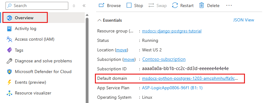 Com o banco de dados PostgreSQL protegido pela rede virtual, a maneira mais fácil de executar migrações de banco de dados do Django é em uma sessão SSH com o contêiner Linux no Serviço de Aplicativo do Azure.