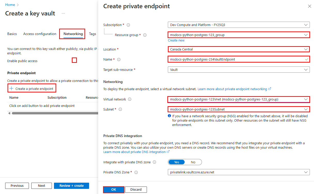 • Zonas DNS privadas: habilita a resolução DNS do cofre de chaves e do servidor de banco de dados na rede virtual.