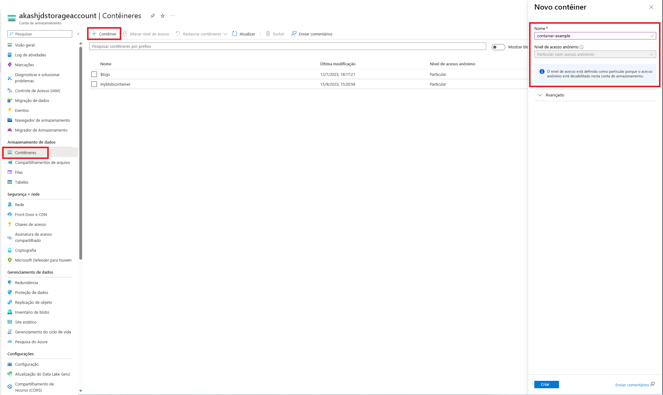 Defina o nível de acesso anônimo ao contêiner. O nível padrão é Privado (sem acesso anônimo) .