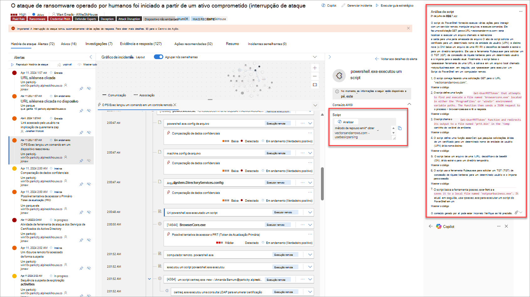 Neste exemplo, Security Copilot é utilizado para realizar uma investigação abrangente de incidentes ao recolher informações contextuais de alertas, analisar um script suspeito e gerar uma avaliação acompanhada por um conjunto de passos de remediação.
