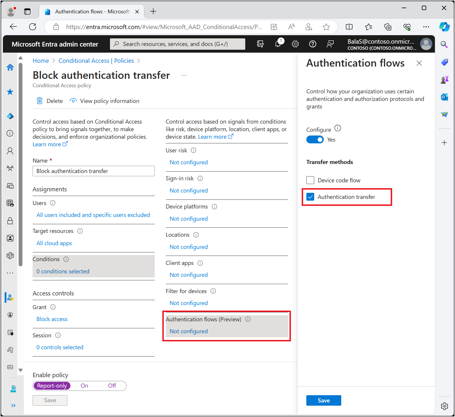 Para criar uma política que use a condição de transferência de autenticação, consulte Bloquear a transferência de autenticação com a política de Acesso Condicional.
