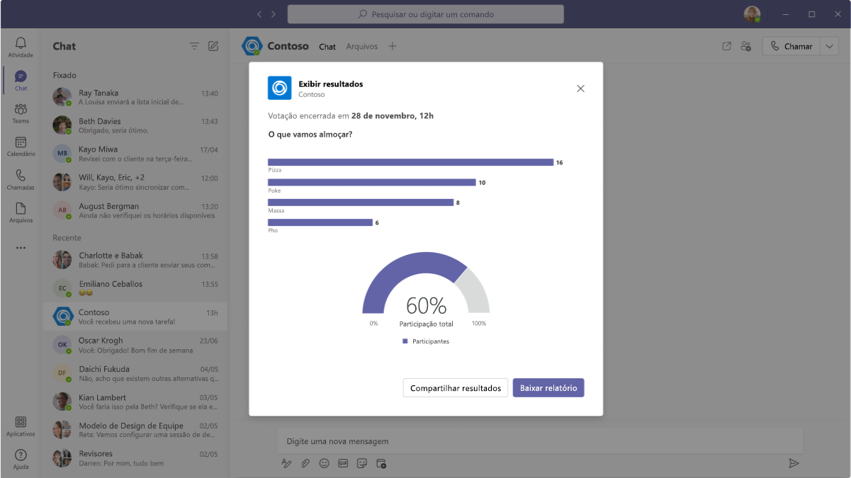 Esse exemplo apresenta os resultados da enquete iniciados de um Cartão Adaptável. O inquérito também pode ser colocado dentro de uma caixa de diálogo.