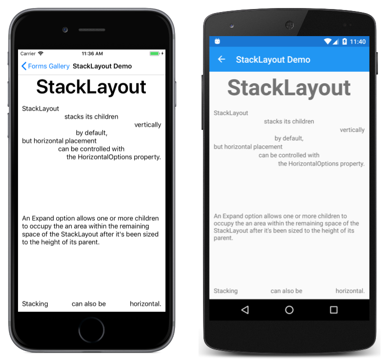 StackLayout Posiciona elementos filho em uma pilha horizontal ou verticalmente com base na Orientation propriedade. A Spacing propriedade controla o espaçamento entre os filhos e tem um valor padrão de 6.Guia de documentação / da API |