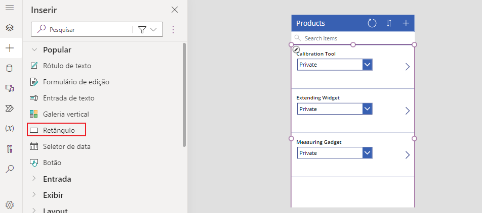 Concat(ThisItem.'Sales channels',Text(Value),",")Verifique se você ainda está editando a galeria. Selecione + Inserir > Retângulo.