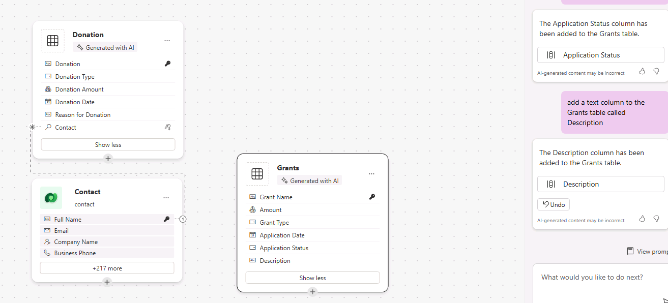 O Copilot deve criar apenas uma tabela chamada Donation. Se mais foram criadas, você poderá excluí-las, informando o Copilot o nome da tabela a ser excluída.