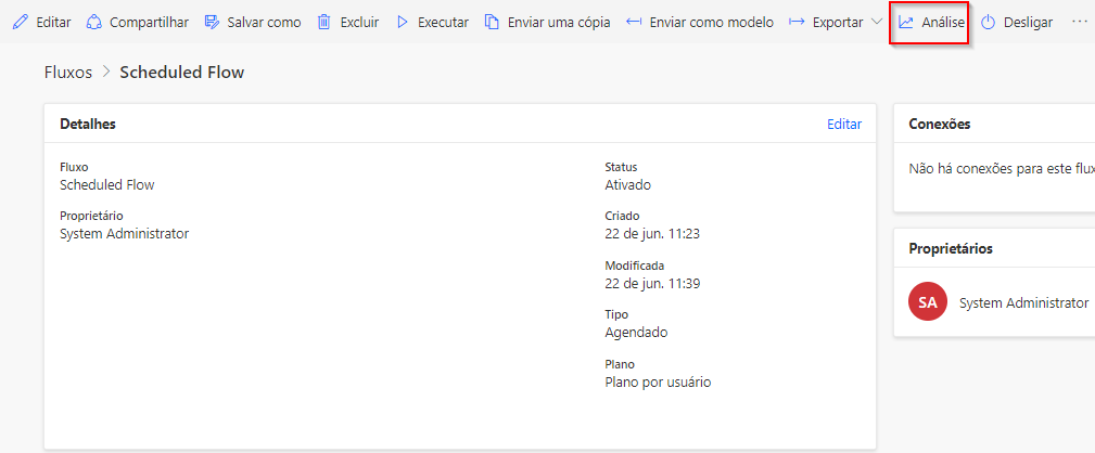 O Power Automate tem uma análise integrada disponível para todos os fluxos. A seção Análise inclui três tipos: ações, uso e erros.