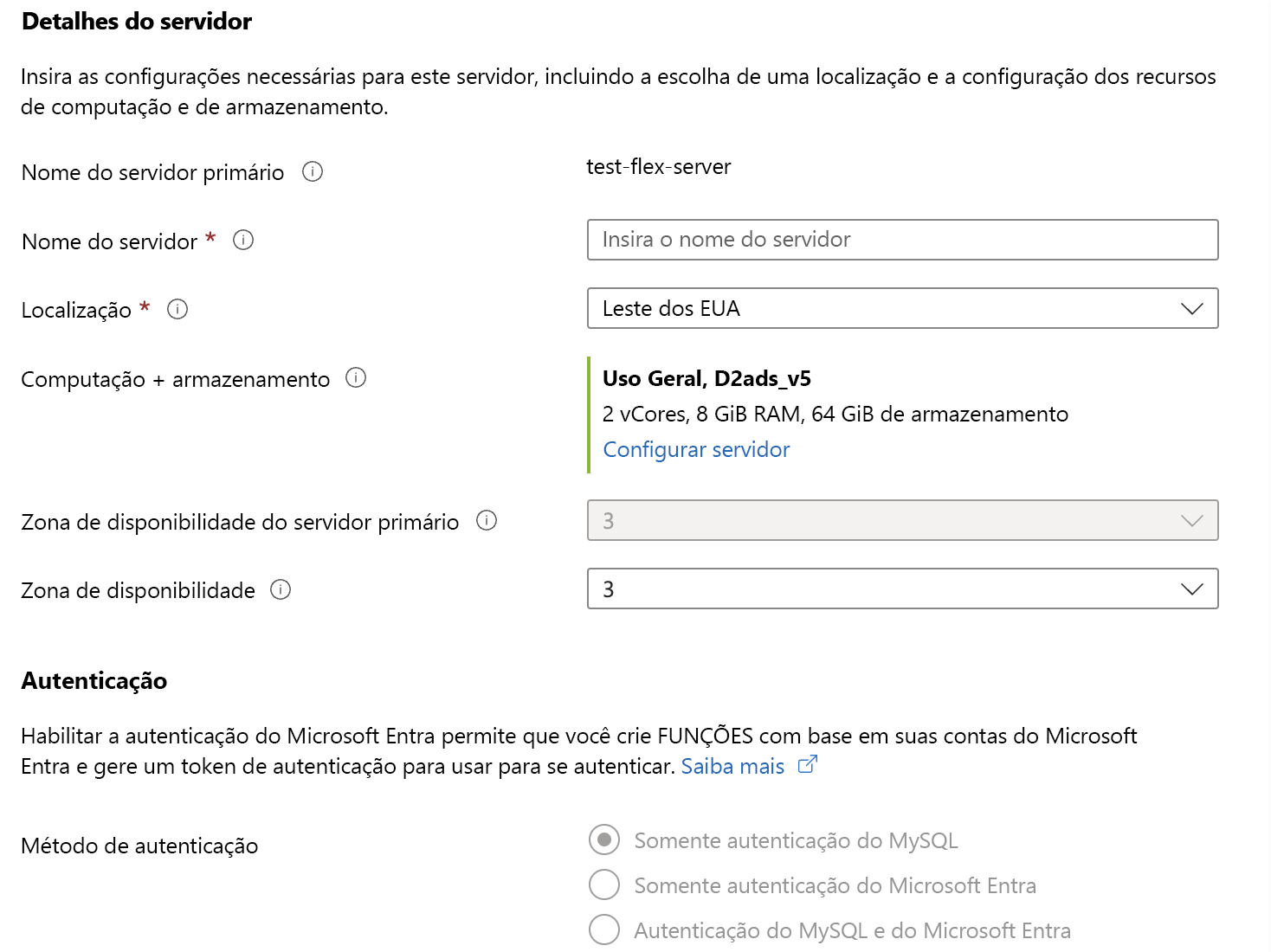 Depois de criar a réplica de leitura, você pode definir o nome do servidor de réplica e suas configurações de computação e armazenamento. Você não pode alterar algumas configurações, como autenticação, que são herdadas do servidor primário.