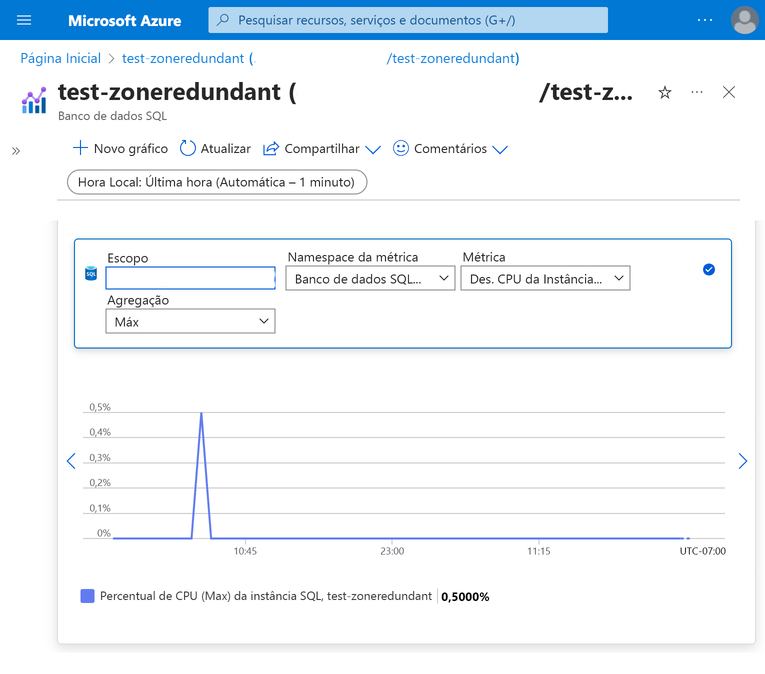 O portal do Azure apresenta acesso a várias métricas que você pode usar para monitorar o desempenho do banco de dados. Por exemplo, você pode visualizar o percentual de CPU usado por um servidor flexível.