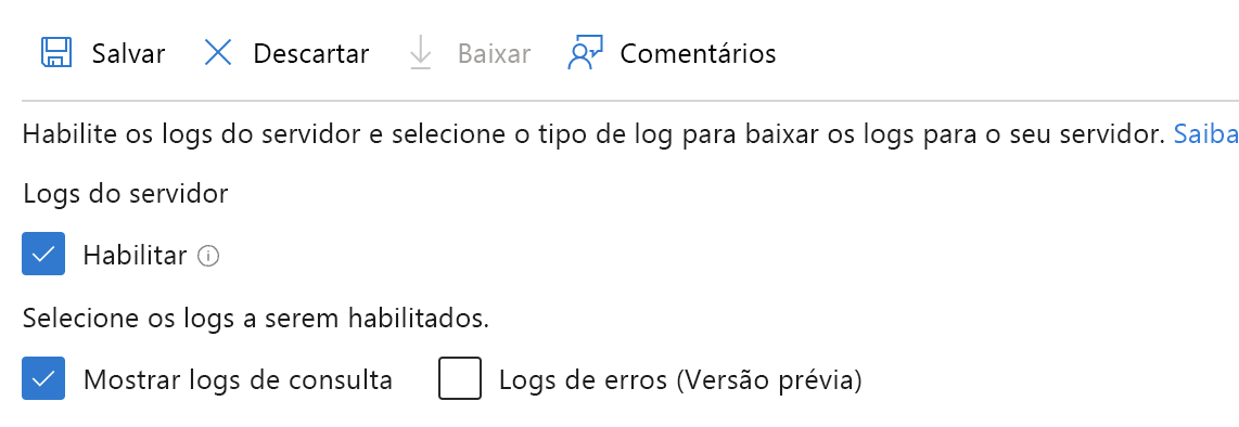 Para habilitar o recurso de log de consulta lenta, na página associada ao servidor flexível, selecione Logs do servidor e, em seguida, marque as caixas de seleção "Habilitar" e "Logs de consulta lenta".