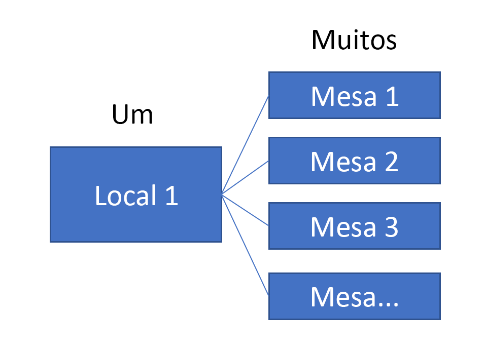 Os relacionamentos um para muitos são os relacionamentos mais comuns com os quais você trabalhará no Dataverse. Esta unidade continua o cenário em relação à solução de espaços de trabalho compartilhados (compartilhamento de mesa) na Contoso. Para ajudar a explicar como trabalhar com relacionamentos em um aplicativo de tela, os exemplos a seguir usarão o relacionamento entre as tabelas Local e Mesa. O diagrama a seguir é uma visualização do relacionamento e dos dados correspondentes.