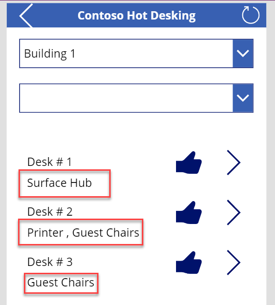 Filter(Desks,Location.Location = FilterLocation.Selected.Location,IsBlank(filterFeatures.Selected) || Desk in filterFeatures.Selected.Desks.Desk)Salve as alterações (se necessário).