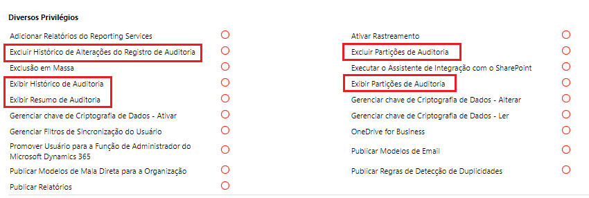 Os direitos de acesso oferecem vários privilégios relacionados à auditoria e que podem ser concedidos aos usuários conforme necessário. Por padrão, o Personalizador de Sistema e o Administrador do Sistema têm alguns desses privilégios habilitados. Eles estão na seção Diversos da guia principal de registros. Quando você concede esses privilégios aos usuários, saiba que eles valem para todas as tabelas, linhas e colunas.