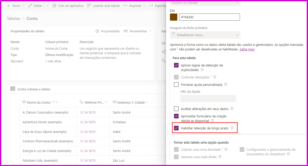 Primeiro, você precisa ativar a retenção de dados de longo prazo nas propriedades de uma tabela no Power Apps maker portal.