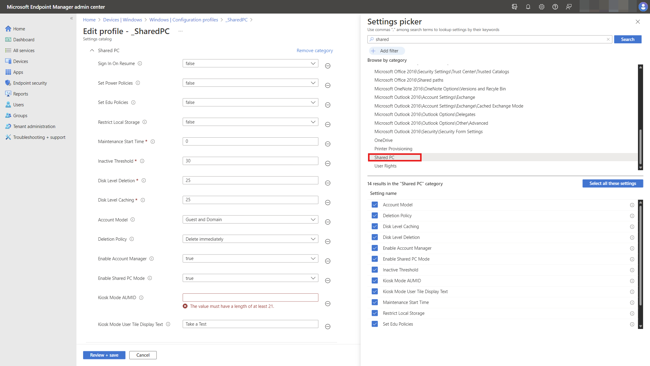 Para configurar dispositivos com Microsoft Intune, crie uma política de catálogo de Definições e utilize as definições listadas na categoria Shared PC: