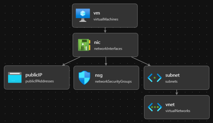 O Bicep Visualizer mostra os recursos definidos no arquivo Bicep e as dependências entre eles. O diagrama a seguir é uma representação visual de um arquivo Bicep para uma máquina virtual Linux.
