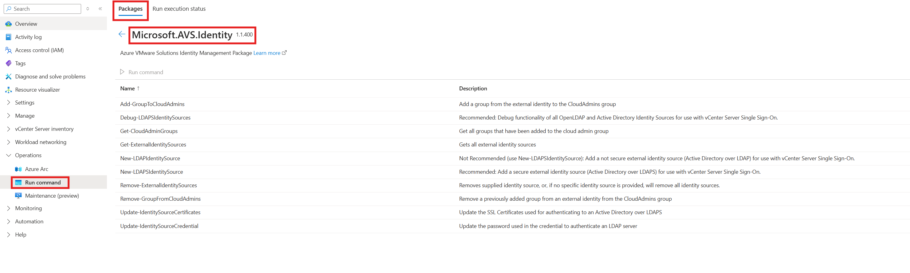 Selecione Executar comando>Pacotes>Microsoft.AVS.Identity>Update-IdentitySourceCredential.